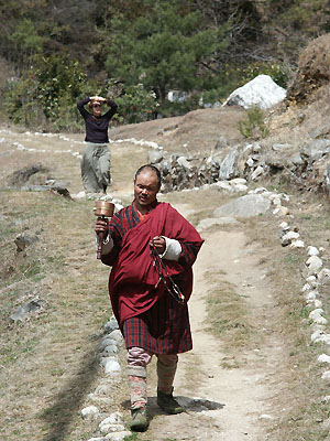 sacred site in Bhutan. Marcia in the background following the local with his prayer wheel