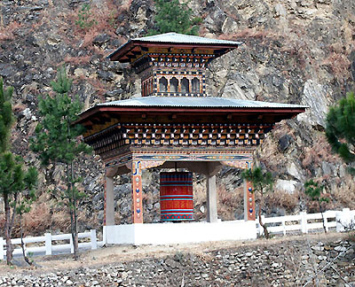 Bhutan. Here is a newly constructed prayer wheel shrine on the road to Thimphu.