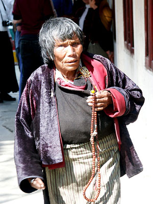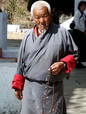 Old man with an awesome head of gray hair circumambulating the chorten. The