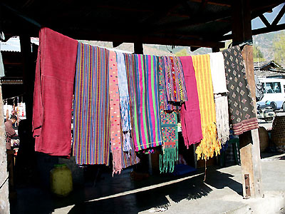 This colorful photo is a set of "yathras" for sale, shawls made of yak wool (sometimes sheep wool),