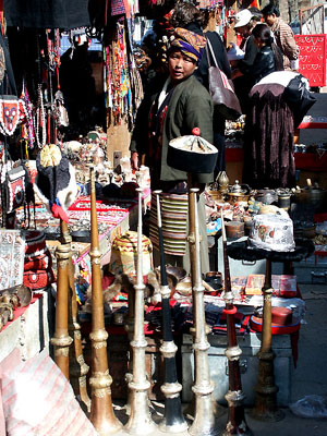 A vendor of various religious and cultural artifacts is almost camouflaged among her wares...