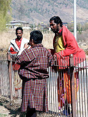 These two gentlemen outside the fence in colorful robes appear to be Hindu sadhus, a bit unusual of a sight in Bhutan. However,