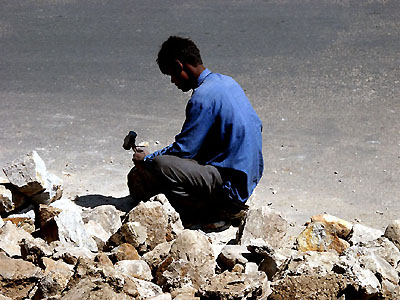 Here a young man is cracking rocks in downtown Bhutan. You see this all over the country, people cracking big