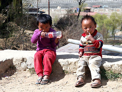 A couple of young waifs watching the strange tourists, with a coke bottle being used as play toy.