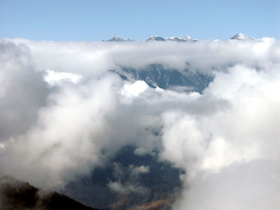 When the clouds part, at any moment wonderful vistas of high peaks make their entrance.