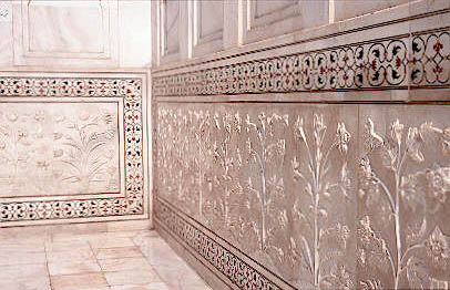 These are red sandstone and white marble structures that are beautiful themselves, but are dwarfed by the