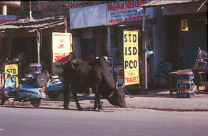 Back to the familar sights of downtown Rishikesh and the unusual street traffic. City cows and bulls eat all sort of paper trash in an attempt to fulfill their cellulose needs.