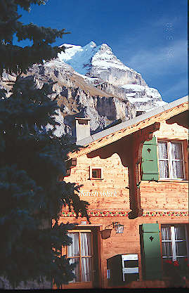 This is a typical Swiss home in the town of Murren, a stunningly beautiful village 5400 feet above the Lauterbrunnen Valley in the "JungFrau" region of the Bernese Oberland in southwestern Switzerland. The snowy Mannlichen peak stands majestically behind this quaint but expensive cottage. Murren sits on a the side of a mountain so steep that you must take a cog railway from the valley to get to it, and the railroad cars are pitched at a 45 degree angle. Quite a ride though, and quite a view.