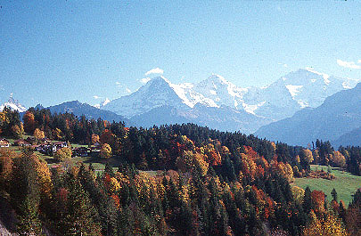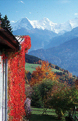 Not mentioned in any travel guide that we read was the wonderful discovery of the town of Beatenberg. This beautiful little town offered breathtaking views of the Jungfrau mountain peaks. To top it off, we arrived near the peak of foliage season, which only heightened the specter. The three snow capped mountains in the background are the Eiger, the Jungfrau and the Monch (you may have heard of the Eiger from the Clint Eastwood movie, 'The Eiger Sanction', where the near cliff face of the Eiger is scaled). The Jungfrau peak, at over 12000 feet, is a major ski resort in the winter time, and is the terminus for highest railroad station in Europe.