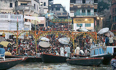 The chaos was at its peak at the central ghat of Varanasi, the Dasaswamedh ghat. Dasaswamedh mean "ten horse sacrifice", a place where the Hindu Lord Brahma sacrificed 10 horses. This is normally a huge plaza and every square inch has been swallowed by the sea of humanity. I could not imagine what it would be like to be in that mass of people.