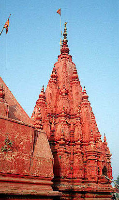 Durga is the fierce form of Lord Shiva's consort Parvati, and the temple is died in red ochre. This spire is typical of Northern Indian style temples.