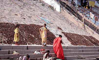 used. Here we have the locals drying cow dung on the ghats of the Ganges for eventual use as cooking fuel.