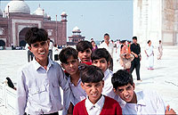 Then the kids showed up. There were tons of uniformed school kids doing the field trip thing to the Taj Mahal. One kid comes up to me and does the "Hellow, what is yo name?" thing which I really enjoy, and he asks me to write my name in his English workbook. So I do, and all of a sudden I am accosted by at least 50 kids all whom want my autograph, even the usually reticent young girls were aggressive. Gave me an idea how a celebrity feels. But the incident really picked up my spirits.