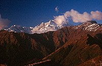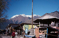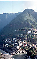 I am one hurtin' unit, but I make it to the temple grounds an peek inside the temple. Despite the shock to my body, I can feel a wave of deep equanimity come over my body, which I am thankful for, some reminder as to why I made this 3km trek at 10,000 feet. Hari is getting a bit worried 'cause the sunset is getting on mighty quickly and it is going to be mighty cold mighty quickly. Getting down I thought would be easier, but it was just as painful. Despite the pain, the view was so, so magnificent, and I burned through a roll or two of film. The path to the temple is very well constructed, shale rock planted sideways to give good footing, but nevertheless at times I'm like a drunken sailor, stumbling here and there. It seemed like an eternity to get off that mountain, and by the end of the little trek, we were using moonlight to find our way down the path. Needless to say I was relieved to see Kuku and his cab. We got in and Kuku hauled ass in the dark through some really treacherous roads to get to Gopeshwar, where we were to spend the night. As bad as the altitude shock to my system, it was nothing compared to the sanitary shock I was to receive in Gopeshwar.