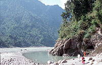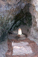 So I go to my room to rest, feeling at the moment overwhelmed, lost, and wishing I had those shoes one could click to go home like Dorothy in the Wiz. It's gotta arise every so often, like what the hell am I doing here - I'm as far away from California as you can get - if I go any further east, I'll be getting closer to home, being that mother earth is round. But this was really the first time that kind of feeling arose. The presence of the shakti, the distraction of the newness of being in a strange place and the feeling of awe and wonder really have dominated my emotion state for the most part. And sometimes I feel a little raw, rookie-like, and like a small person in a big world, but I've come to realize that most of those kinds of moods are attributed to hypoglycemia, low-blood sugar - put some food in me and then I feel strong, ready to take on the world again. This pattern has gone on so long for me, that I know how to read the signals. But I am alone, and have met but a few people along the way, and I sometimes feel the aloneness the most at dinner, which is really a social occasion as much as anything. But, despite the aloneness, which only occasionally turns into loneliness, and they are two separate states. And being alone and white-skinned in an Indian world, peoples' staring at me reinforces that aloneness. Walking down the street, I am an event, a rare bird in the whatever 'hood I am cruising. Men stare are me, the women too, but they avert their eyes as soon as we meet, and men are always hitting on me 'cause I got something they want. And it got me to thinking, hey this is what a woman in a something tight or short must go through when she walks down the street! I've gotten used to it, and the best strategy is to smile, which breaks up the pattern, and most of the time I get a smile back. Every once in a while I hear something like "eoereiklsdkoAmerican woqdklsdeoeioklsiore" and I give the group of guys a stare. And almost always, walking through the street, I am the only white person to be found, but I feel totally _safe_ here, despite the fact that everybody knows I am a lot richer than they are, (just by the fact that I am here) and therefore probably have a lot more money on me. I don't go wandering too much at night, but here in Rishikesh that would be no problem. But having a shaved head and a goatee gets you looks everywhere east or west - it looks a little too masculine, mean, like one is a gang member or mental house escapee. Little do they know what a cupcake I am on the inside. After a while, the desk calls to tell me that the hotel travel agent is here. I go downstairs to meet Beehm, a very nice fellow who sets up my next two days around Rishikesh. One of my goals is to get to Badrinath, the site of one of 4 of the holiest of temples in the Hindu world, as well as get a good number of Himalayan snow-capped mountain pictures, but Badrinath is snowed in and there are landslides along the way - I'm a few weeks too late, but the road is still open to Josimath, which is 40 km south of Badrinath. But Beehms says it's best to plan that as late as possible so that were working on good information. This relieves any suspicion that he's out just to sell me a package without any consequence. And this feels good - I'm now a man with a plan, to visit the sites of Rishikesh proper the next day, then into the forest to outlying temples and good Himalayan views the next. (Are my days and dates correct? I am on vacation, out of the regular routine). I setup my itinerary with Beehm with an additional fun lesson in Hindi, for words like stop, taxi man, go, please, thank you, etc. Vasishta GuftaMy first stop is a cave about 10 miles outside of Rishikesh called the Vasishtha Gufta. This is where the famous Hindu sage Vasishtha did his sadhana (spiritual practice) ages ago, and now is a temple site. My taxi driver Pal negotiates the winding curves through the Himalayan foothills with skill and even some courteousness. I've finally figured out how the driving scene is in India - it's a pecking order: pedestrians give way to bicycles and motor scooters, then bicycle-rickshaws, then motor-rickshaws, then taxi, then busses and trucks, and at the top of the order, cows. Auto-rickshaws alway pass pedestrians, who for the most part walk on the side of the street, since there is often no sidewalk, or if there is one, it is covered with street vendors. But taxis always try to pass the auto-rickshaws, and even the busses, who all have a sign on their back bumper: "Horn Please". You see, it's the horn that makes the whole system of chaos work. When you pass or about to pass, you lay on the horn, if you move into a mountain curve you lay on the horn, if you come up to a group of pedestrians, more horn. It's a bad thing for the nerves, but a good thing for bodily safety, especially for me - remember, we in the Americas drive on a different side of the road as the Brits and some of their former colonies like India, which means I must discipline myself from habitually walking into traffic by looking the wrong way! The horn is a constant help for me to know which way to look, since I can forget so easily.