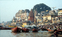 To my good fortune, I just so happened to book this part of my journey during the Kattika full moon, which is a time for a huge celebration, with lights and candles and dances, and plays and fireworks and in general a helluva party. I got to Varanasi after taking the Shatabdi Express train from Dehra Dun, just outside of Mussourie, which took much longer than expected, and was over 5 exruciating hours, for some reason. I again braced myself for the Delhi train station, and just before getting off the train, I befriended another fellow with a backpack, a young Indian man named Ghosh, who mentored me through the train station, and right to a bicycle rickshaw which is the cheapest form of transport. Unfortunately, my rickshaw driver, either on purpose or not, thought I said the hotel Kumar instead of the hotel Connaught, and I went on this really intense adventure through Delhi - first going exact opposite of where the Hotel Connaught was, through some really strange neighborhoods, and wondered if I was being set up for a mugging, and finally into the Connaught Circle area of Delhi. I turns out he really did not know where my hotel was - apparently not too many people go to the 3 star Connaught via bicycle rickshaw. Either that or he was a really good actor, which goes around a lot, the fake "misunderstanding" number. So finally after a 45 minute adventure (which should have taken 15), I get to the Hotel Connaught near midnight, only to find I didn't confirm and now there's no more room. Fuck. So, being a good New Yawker, I display my disappointment most graphically, but without cuss words. The hotel manager had the good sense to call my travel agent, Mohet, who came over at midnight to bring me to another hotel. He told me that he had another nice hotel to put me up in. Travel Tip: When a young Indian man tells you about the nice hotel you're about to go to, watch out. Sure enough, it was a seedy little guest house with spit on the walls and a bathroom that needed sandblasting and big cockroaches, but I was only there for 7 hours, and now being a hardcore Indian traveller, no longer gave a fuck. I had my sheets and did my bed number, took a hot shower, and got as much sleep as possible for the next day's flight to Varanasi. There are two worlds in India, one the dirty, noisy, overpopulated world, and the rich world. The domestic airport of India, where Indian Airlines is based, is part of rich world. Passing the gate to the terminal, you enter rich world, which is simply a normal, clean, new, spacious and pleasant airport terminal, one of the nicest I've ever been in. But the security was amazingly tight, with the Indian army doing the work. First a body frisk, then intense bag scrutiny, then once you're inside the waiting area, you have to walk out to the baggage handler area and identify your bag, or else it is not put on the plane! Now that's what I call top quality security. So I board a bus which takes us to the plane somewher else on the tarmac, another security precaution, I guess, and have a very pleasant plane ride. But I was pretty shot from all the travelling. When I got to the baggage area in Varanasi, some guy who wanted to carry my bags just would not leave me alone, following me around. Finally after he said "Yase" one too many times, I turned to him, put on my mean face, which I really meant and yelled "NO!". Turned some peoples' heads but he finally got the message. Got my extremely heavy bag, and decided right there, I was going to send a lot of my shit back home, really lighten my load. I met Ajay, an intelligent and knowledgable tour guide who unfortunately speaks in an express- ionless monotone with a Hindi accent, which can do wonders for insomnia. But he is wealth of information, and I appreciate that. I immediately took a liking to Varanasi - it's bigger than Rishikesh, but less polluted, and there's something special about the place, you can feel it. It is really, really old and traditional, that's why I call it The Essential Hinduisn. We drove through countless streets (obviously no grid pattern in this city) till we reached the Assi Ghat area and my hotel.