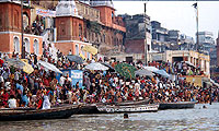 And part of this hotel's charm is that the hotel serves dinner to the guests as a real family kind of thing, and I get to meet the people in the hotel, as well as the blonde entourage women. The lama is having dinner also, and asks me who I am and where I am from, and it turns out he has a retreat site in Mendicino County, CA, not far from my home in San Rafael. Next door to me are 4 German ladies from Bremen, and I end up having an hour conversation with one of them, an HSP, a "highly sensitive person" who is really soaking up the Indian experience for the first time, and it's intense for her, to say the least. But since she is also very sensitive to energies, we have a wonderful conversation about our impressions in India. She makes the insightful comment that even though there seems to be a lot of spiritual stuff going on and even a lot of practice, she feels that no one is really breaking through, and part of the reason is that the motivation is based too much on escapism, there is not enough grounding in part of the practice. I couldn't agree with her more. The tendency to go "up and in", the avoidance of "worldliness" runs so strong that it itself is a barrier to realization, in my opinion. I could say tons more on this subject, but for the sake of brevity, no more on that. We also discussed the beggar situation. You see, right below our hotel, on the sidewalk are a line of beggars sleeping on the ground, including several familiies. The stark contrast of being a priveledged western person in a nice hotel room right there, 10 feet from people who have utterly nothing but their hunger, really pounds home the fine line between the haves and have nots, and the extreme differences in lifestyles and living. The contrast to me, and to the German woman was very intense and brought up a lot of sadness. But as the lama stressed, you must match compassion with skillfulness, lest you give away all your money and you end up being the next beggar. India is a land of stark, stark contrasts, in fact that is its major attractive features, and it is these huge contrasts where a lot of energy is brought into the world, generating a hypnotic attractiveness that brings peple coming back time and time again. But anyway, by the time I went to bed, I had two dinners and met some really interesting people, and was in a totally different and emotional headspace. I was really, really liking it here, and again, was back to the sheer enjoyment of this most amazing country. I had to cut my talk off with the German woman (and even speaking in German a bit, which I feel so proud of!), because I have to get up at 5:00 to go on my first tour - to watch the sunrise and morning bathing on the ghats, one of the truly "must see" experiences for us pasty white people of the west. Morning Ganges Bathing RitualMy alarm clock didn't go off, and I awoke 15 minutes late, but it didn't matter,as my guide couldn't get into the locked front veranda of our hotel (most guest houses seem to have gates, making them fairly secure). So I had to find one of the hotel worker boys, and shake him quite vigourously to wake him up and unlock the gate doors. There was a huge mass of people on the beach in front of my hotel - thousands of people going to and fro, taking a bath, checking out the scene, selling stuff, etc. The streets were lined with beggars, and the custom today is to bring a bunch of raw rice or other grain, and hand out a handful of grain to the beggars as baksheesh. One of the rare days I see Indians even acknowledge their fellow Indian beggars. It was a caucauphanous pre-dawn multitude and due to exhaustion and earplugs I heard nothing.
