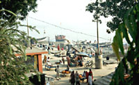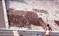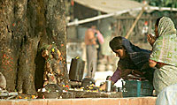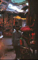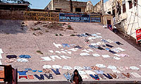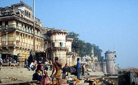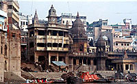 The burning body closest to me is about half burned. I can't recall being so close to a decomposed body and it reminds me of the scene from a concentration camp movie. But there really is no reaction in me to the body at all, it's just another thing, watch it burn, skin all gone, mostly charred skull and major bones. The hospice guys says that the two hundred kilograms of wood needed to burn a body still does not completely burn the big bones, like the skull, hip bones, and femur, and they along with the ashes, are thrown into the Ganges. The next funeral pyre is just being prepared for burning, an old woman wrapped in a beautiful sari-like cloth. Hay is placed inside the pyre and the priest circumambulates the pyre three times with a torch of burning hay in the hot burning sun. He then lights the hay in the center of the pyre, and it goes up in flame. He throws some kind of brown powder onto the pyre, don't know what it is. In the furthes pyre, the family is carrying the dead body, wrapped in cloth and colorful wraps, through the alleyways and into the Ganges for a final dip. It is important that water goes into the mouth of the dead body to symbolize the last drink from the Ganges. Then the body is placed onto the pyre and more wood is stacked around it. The elder male of the family shaves his head as part of the funeral ceremony. I was able to watch this endless procession of funerals and burning for about 15 minutes in the heat of the midday sun. There was no awful smell, in fact, it was a helluva better then the festering sewage heap of the old city. When the smoke did come my way there was only a touch of burning tissue, mostly wood (no, I am not getting off on this, believe me, just reporting the facts, ma'am). Finally someone came over to me and asked me to leave, as the place I was standing was for the families, and then he asked for a donation. AAAAAaaaghhh! On the way to the main Ghat, the Dasaswamedh ghat (the ten horse sacrifice ghat), I checked out a 6 inch crystal shivalingam for only 400 bucks - sooo tempted, but too heavy.