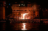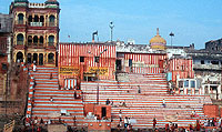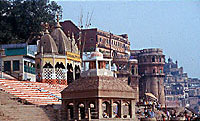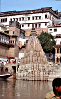 I stay at the inner chamber railing, containing a small altar with a cobra icon, for a while, which always seems to surprise or annoy the temple priests, like I'm stealing something, or getting too much of the show. But too bad! As I move away, I go towards the table containing ash and kum-kum, the red substance that Hindus put on their forehead, sometimes called a "teelak". I forgot the procedure, and use the middle finger of my right hand to apply the substances, and a priest is right there to correct me, to use the ring finger for application. Makes me feel a little stupid. Feeling a bit more emboldened in this very intense atmosphere, I walk up to the replacement priest at the top of the stairs to ask a question, and he gives me a major vibe and head gesture, which translated would be "get the hell outa here, white boy!". Ok, ok, you pissy old sadhu. So I leave, and maybe that was just luck to get in or maybe it is open to all, I'm not sure, but I'll certainly remember the place. Jnana Vapi and MosqueJnana Vapi literally means "wisdom well", a well right next to the Golden Temple where it is described that Lord Shiva cooled off his lingam (it didn't say what he was doing with it to make it so hot!), and thus created a well whose water is said to be liquid wisdom. Unfortunately, the priest had to put a covering over the well, as some people were trying to off themselves in one huge leap for moksha/liberation, and to prevent the contamination by coins. (Isn't it interesting that the throwing of coins into a well or standing body of water is a universal custom?). But nevertheless it is a wonderful temple complex, very spacious in comparison of the crampness of the Old City. One one side is the Golden Temple, and the other side is teh Jnana Vapi Mosque, which is actually the original site of the Golden Temple. However there was one Moghul butcher/emperor named Aurangzeb (the son of Shah Jahan, the creator of the Taj Mahal), who, when conquering Northern India, would destroy the Hindu temple and place a mosque right on top of the site. So you can imagine how old and deep the hostilities between Hindu and Muslim must go, knowing that a mosque is right on top of your Hindu holy site. And because of that, the mosque has incredible security, barbed wire, several fences, metal detectors, video cameras all over the place. But no one checks my big backpack - being an American, no one thinks that I could be carrying 50 pounds of C-4, which would blow up a major chunk of the Old City. It seems like a security breach to me. So I circumambulate the well, brushing off the self-appointed guides and shoe guy who eventually will want a donation - as in the the line in the Dead song "Trucking" - "the just won't let you beee, oho no". The well is 6 foot in diameter, and is a real beautiful place and has a presence. Once completing a circumambulation, I go to the temple priest, who talks me into a personal puja for 100 rupees, for a long life for me and my family - it seems so tacky, but hey, what's two bucks? As part of the puja, I am to drink three offerings of well water from the priest - ordinarily when I receive holy water to drink from a priest, such as every night on the Assi Ghat after Gangarati, I always fake the drink to the mouth and pour it over my head, knowing that the water is coming from the bacteria-festering Ganges river. And I notice many other westerners doing the same. But this water, I take in, and it tastes clean and refreshing on this hot day. So I get my long life puja, and find my way through the Old City, past cow and dog and shit and stench and sewage and tout and guide and heat to the Manikarnika Ghat, the burning ghat, where bodies are burned for hopeful liberation. The Manaikarnika Burning Ghat