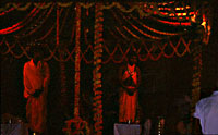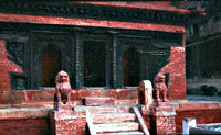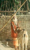 I am both annoyed by all the touts and shopkeepers trying to lure me into their stores or to become their guide (and have to give some my mean and nasty look with pointed fingers to get through to them), and very charged by the potency of the temples that I have visited. Passed by the Sani/Saturn and Annapurne temple which is on the same alleyway as the Golden temple. In fact, I pass the Golden temple several times in my traversing the human rat-maze of the Old City of Goudalia, just for the blessing. The Rough Guide mentions that there is another Viswanath temple in the Old City (in addition to the more famous "New Viswanath Temple" in south Varanasi, on the University campus). This intrigues me, and perhaps I can go inside to this temple. I ask an Indian army soldier where the temple is and if I can go inside, and she says no, I am not allowed. But let's see what happens. Traveller Note: I am finding that The Rough Guide is an invaluable companion to the Lonely Planet, and contains information that is not mentioned in her more famous companion book. I highly recommend carrying both, since you will get specific information not found in the other, and can verify good hotels and restaurants mentioned in both...if you can handle the weight of these two very thick paperbacks. The Rough Guide is definitely more hip, Lonely Planet more conventional. There is also the India Handbook, which I don't know anything about. New Viswanath TempleNot very well known, and only mentioned in The Rough Guide, the New Viswanath Temple of the Old City was built apparently by a conservative bunch of sadhus when a few "untouchables" entered the Golden Temple early this century. Talk about picky! So this second temple was built, and since it was built by more conservative brahmans, I figured I would not have any chance of being let in. But to my surprise, approaching the steps, and making a request gesture to come in, someone a the top of the steps says ok, and I go in.